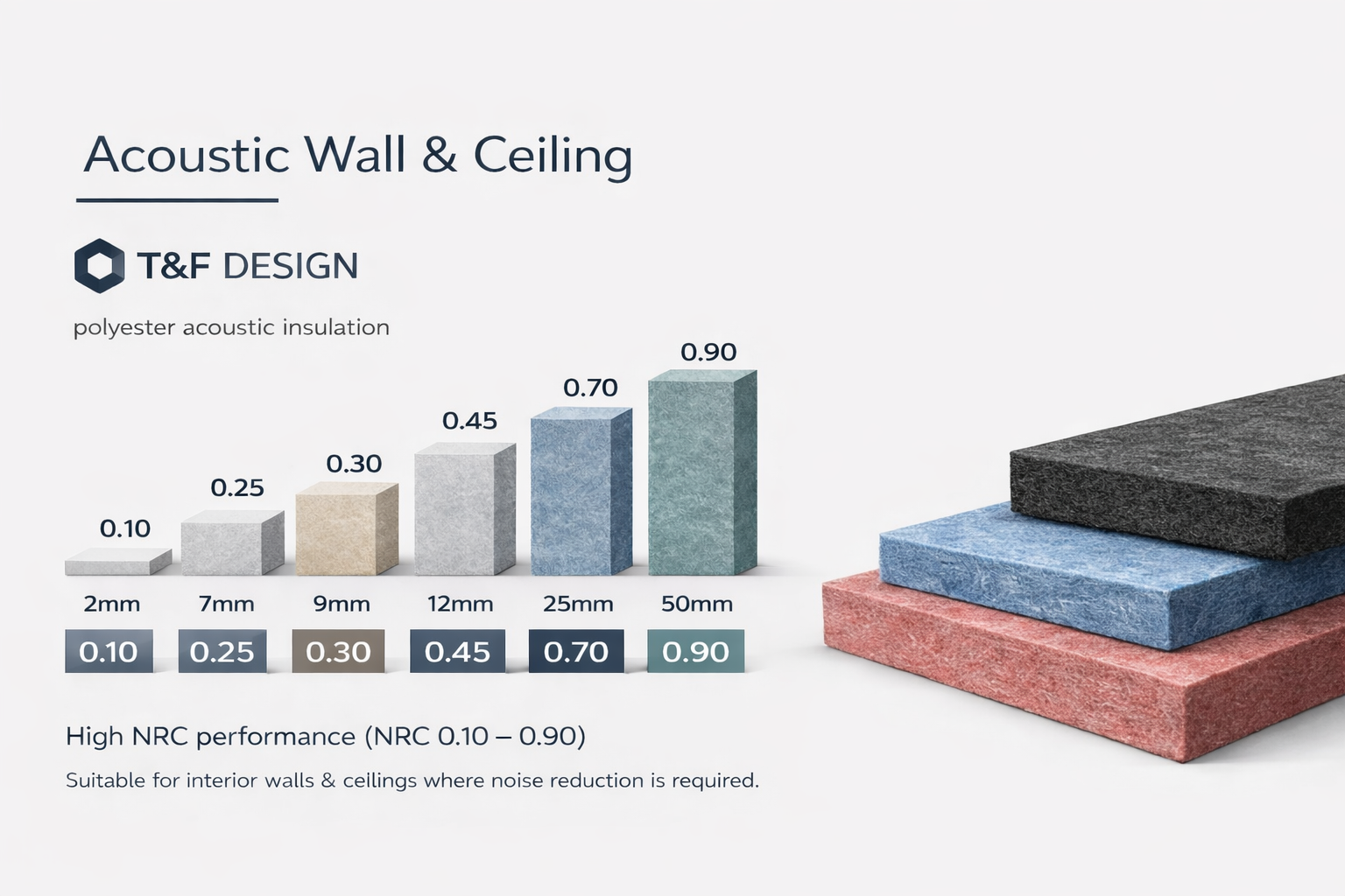 T&F Design places great importance on acoustic design to enhance sound absorption performance and improve sound insulation. High-quality polyester batts (Polyester Batt) are selected, specifically engineered for acoustic applications.